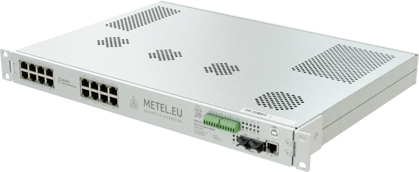 Priemyselný riadený switch 19"/1U podporujúci redundantnú topológiu LAN-RING s portami: 2x SFP+ slot 10 GBASE-R / 1000 BASE-X, 1x RJ45 port 10/100/1000 BASE-T, 16x RJ45 port 10/100 BASE-T s PoE, 2x zbernica RS485 / Modbus-RTU, 2x digitálny/alarmový vstup, 1x programovateľný reléový výstup, 3 nezávislé napájacie vstupy, Redundantná topológia LAN-RING, RSTP, Prepäťová ochrana do 30A (8/20µs), Správa udalostí: IP Watchdogs, HTTP/ONVIF klient, ETH/TCP udalosti, Modbus, DI/relé/alarm..., VLAN, QoS, SNMP, SMTP, SNTP, IGMPv1/2, RSTP, LLDP, 802.1X, Prevádzková teplota od -30°C do +50°C vnútorný zdroj 750W.