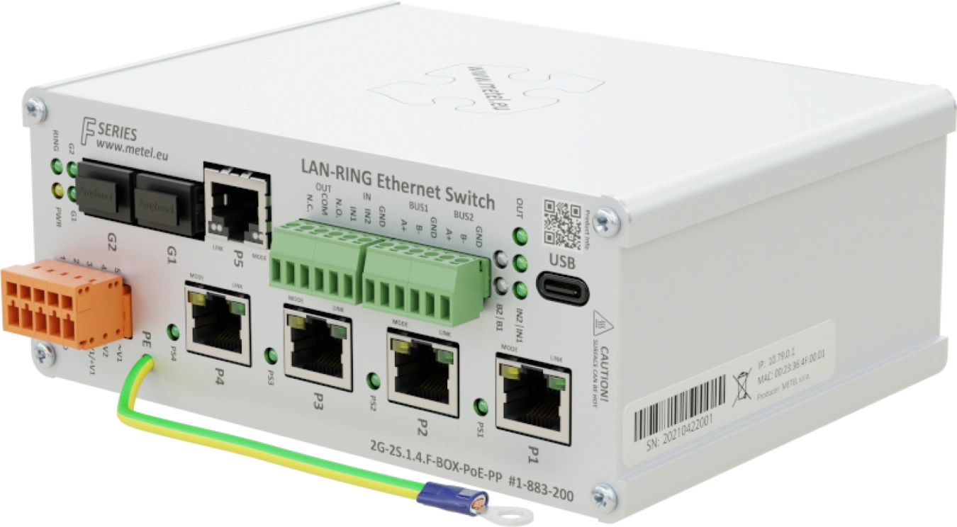 Priemyselný switch pre RING topológiu s 2x SFP slot, 1x GE port, 4x Fast Ethernet port s PoE, podpora UPOE, POH, 802.3af/at/bt, max. 95W na port, maximálny celkový odber PoE na všetkých portoch je 170W, prepäťové ochrany FE portu 1000A, 2x DI s podporou vyváženej slučky, 1x programovateľný výstup NO/NC RELAY, 2x RS485 / 1x RS422 BUS (podpora modulu MODBUS, TCP server, Režim UDP), USB port pre lokálnu správu, redundantný vstup napájania, prepäťové ochrany na všetkých vstupy, EVENT MANAGEMENT: SMTP, TCP udalosti, ETH udalosti, HTTP klient (manažment kamery), 8x IPWatchdog, prevádzková teplota -40...+70°C, VLAN, QoS, IGMP, SNMPv2/v3, SNTP, inštalácia na byt povrch alebo DIN35, 12VDC/24VDC/48VDC/12VAC/24VAC/56VDC