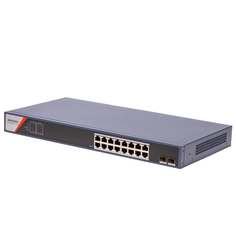 16-portový Gigabit PoE switch Hikvision s 2× uplink a inteligentným PoE manažmentom.