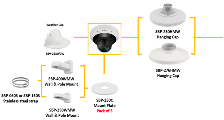 pevný držiak (pole mount) navrhnutý pre montáž SBP-150NBW kabinety (a iných príslušných montážnych riešení) na stožiare / stĺpy pri vonkajších inštaláciách kamerových systémov.